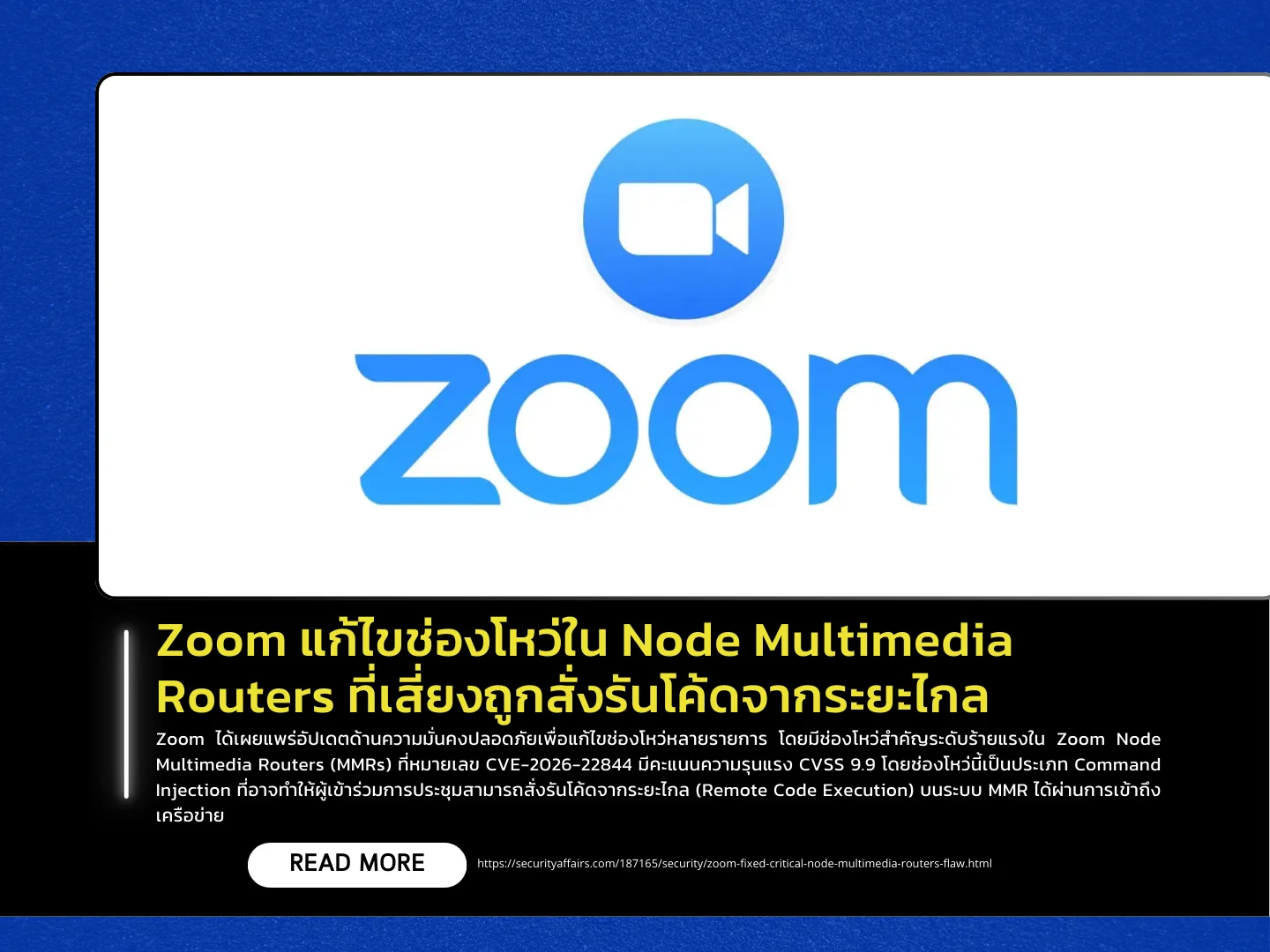 Zoom has released security updates to address multiple vulnerabilities, including a critical flaw in Zoom Node Multimedia Routers (MMRs) tracked as CVE-2026-22844 with a CVSS score of 9.9. The vulnerability is a command injection issue that could allow a meeting participant with network access to execute remote code (RCE) on the MMR system.