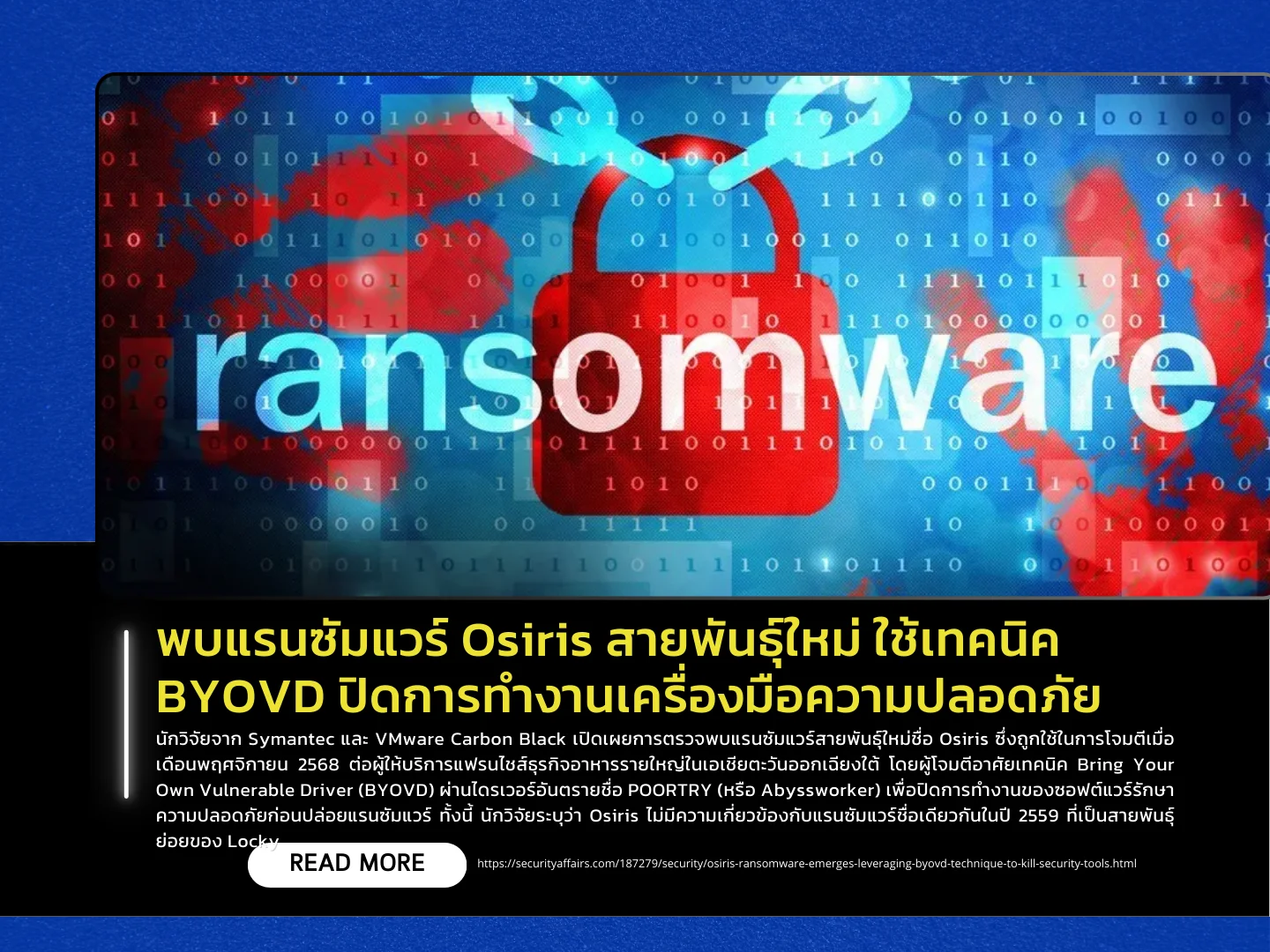 Researchers from Symantec and VMware Carbon Black have identified a new ransomware strain named Osiris, which was used in attacks in November 2025 against a major food franchise operator in Southeast Asia. The attackers leveraged a Bring Your Own Vulnerable Driver (BYOVD) technique using a malicious driver known as POORTRY (also called Abyssworker) to disable security software before deploying the ransomware. Researchers emphasize that this Osiris ransomware is not related to the Osiris ransomware variant from 2016, which was a derivative of Locky.
