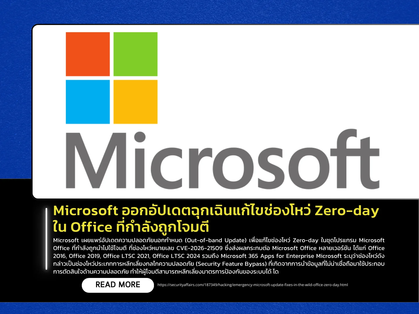 Microsoft has released an out-of-band security update to address an actively exploited zero-day vulnerability in Microsoft Office, tracked as CVE-2026-21509. The vulnerability affects multiple Office versions, including Office 2016, Office 2019, Office LTSC 2021, Office LTSC 2024, and Microsoft 365 Apps for Enterprise.